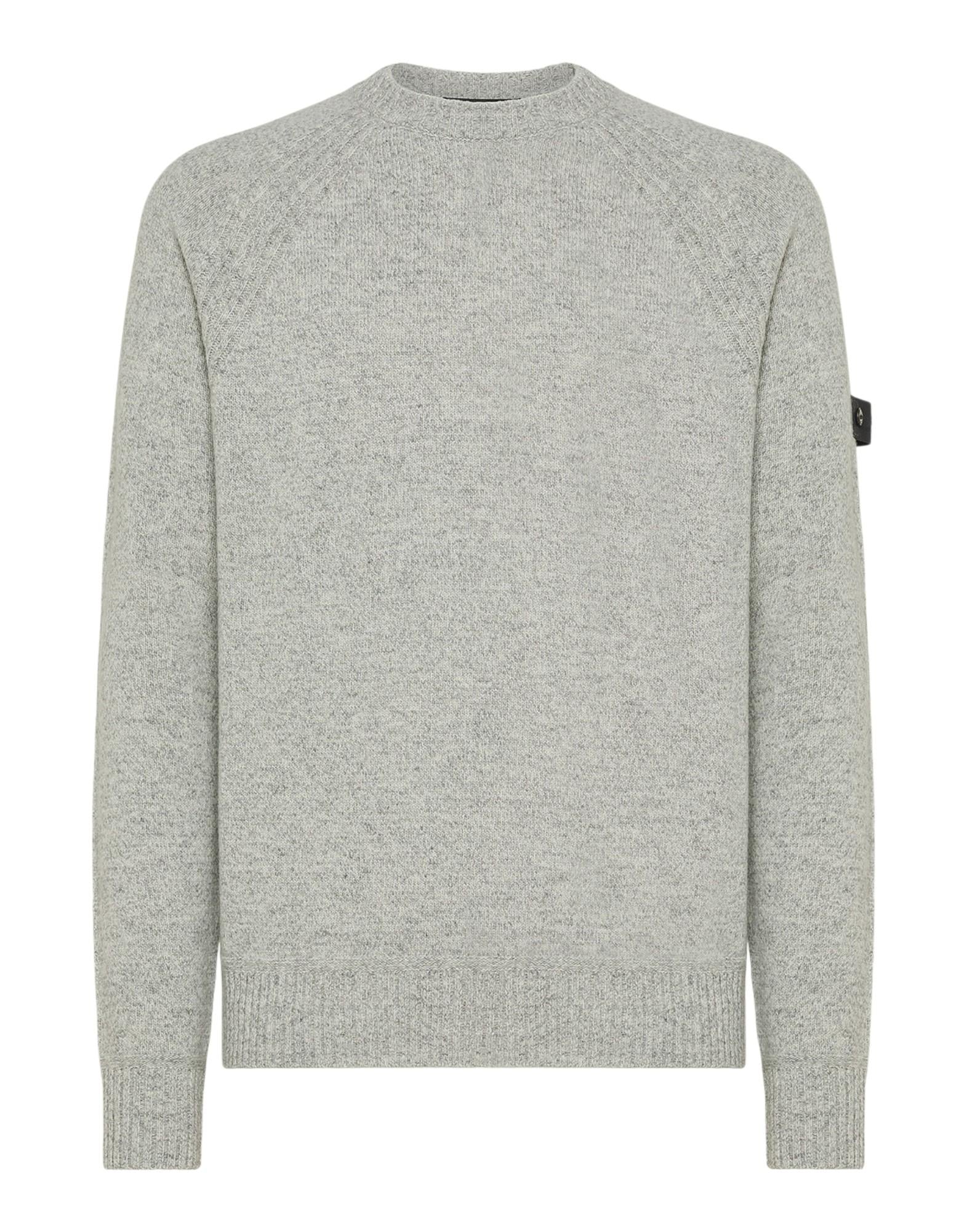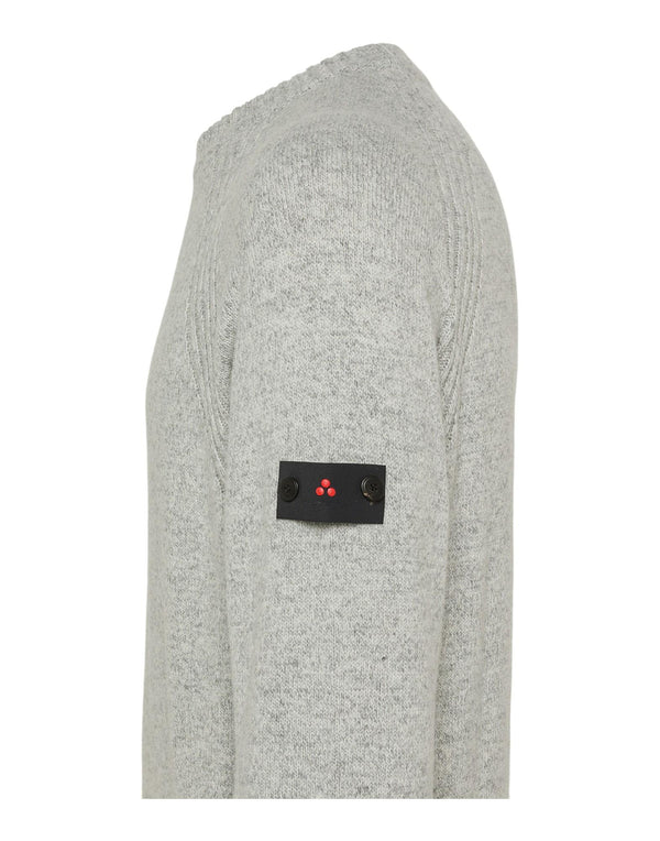 Maglia girocollo in misto lana mouliné, caratterizzata da un raffinato effetto melangiato che conferisce profondità cromatica e una texture sofisticata. Il design essenziale è completato da collo, polsini e fondo a coste, che assicurano una vestibilità confortevole e definita. Sul braccio sinistro è applicata con due piccoli bottoncini la personalizzazione con logo Peuterey Trilogy, simbolo iconico del brand. Un capo versatile e confortevole, ideale per aggiungere un tocco distintivo sia ai look casual che a quelli più ricercati.