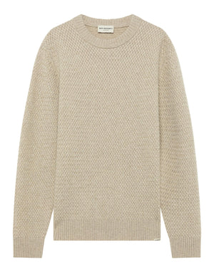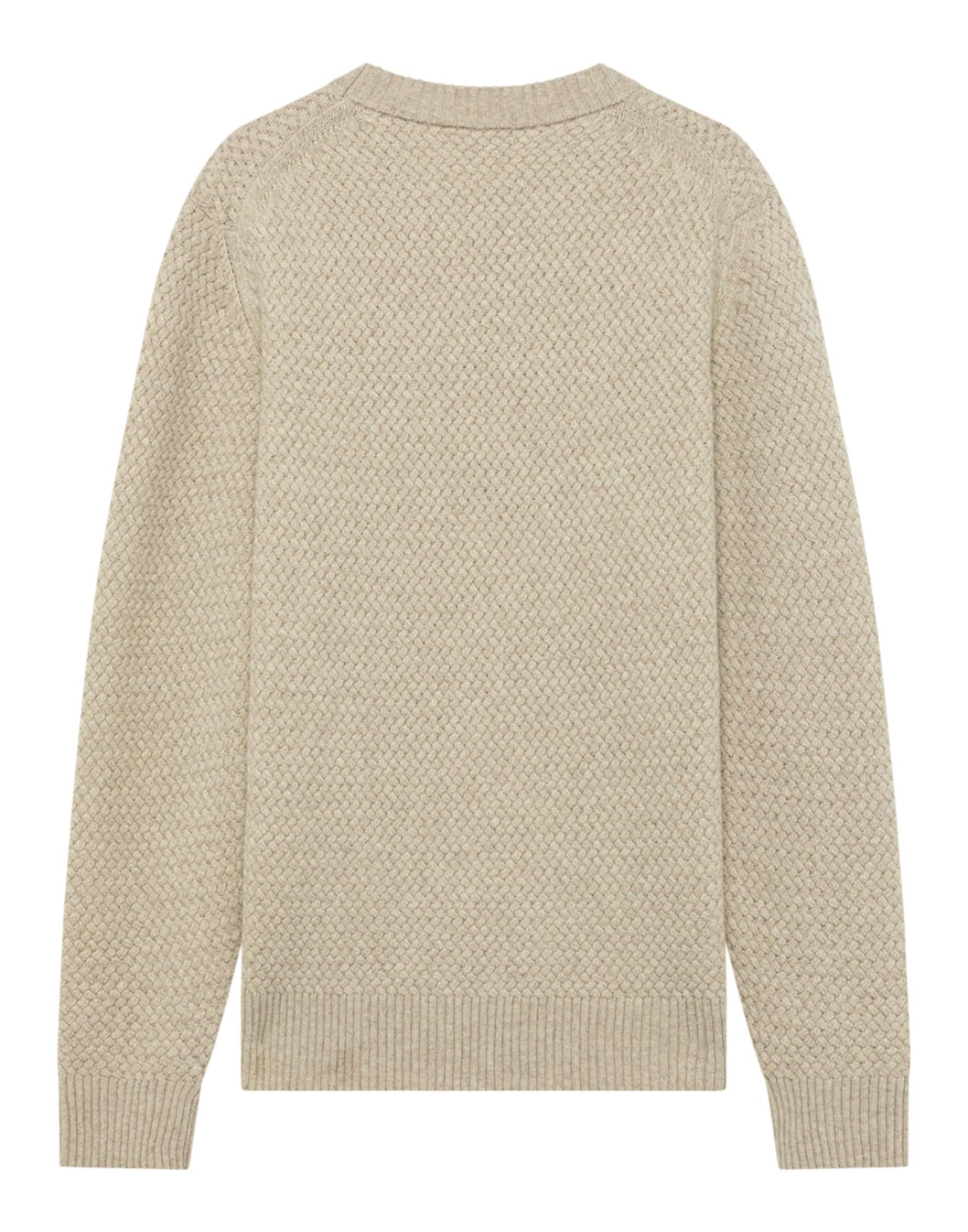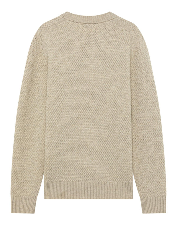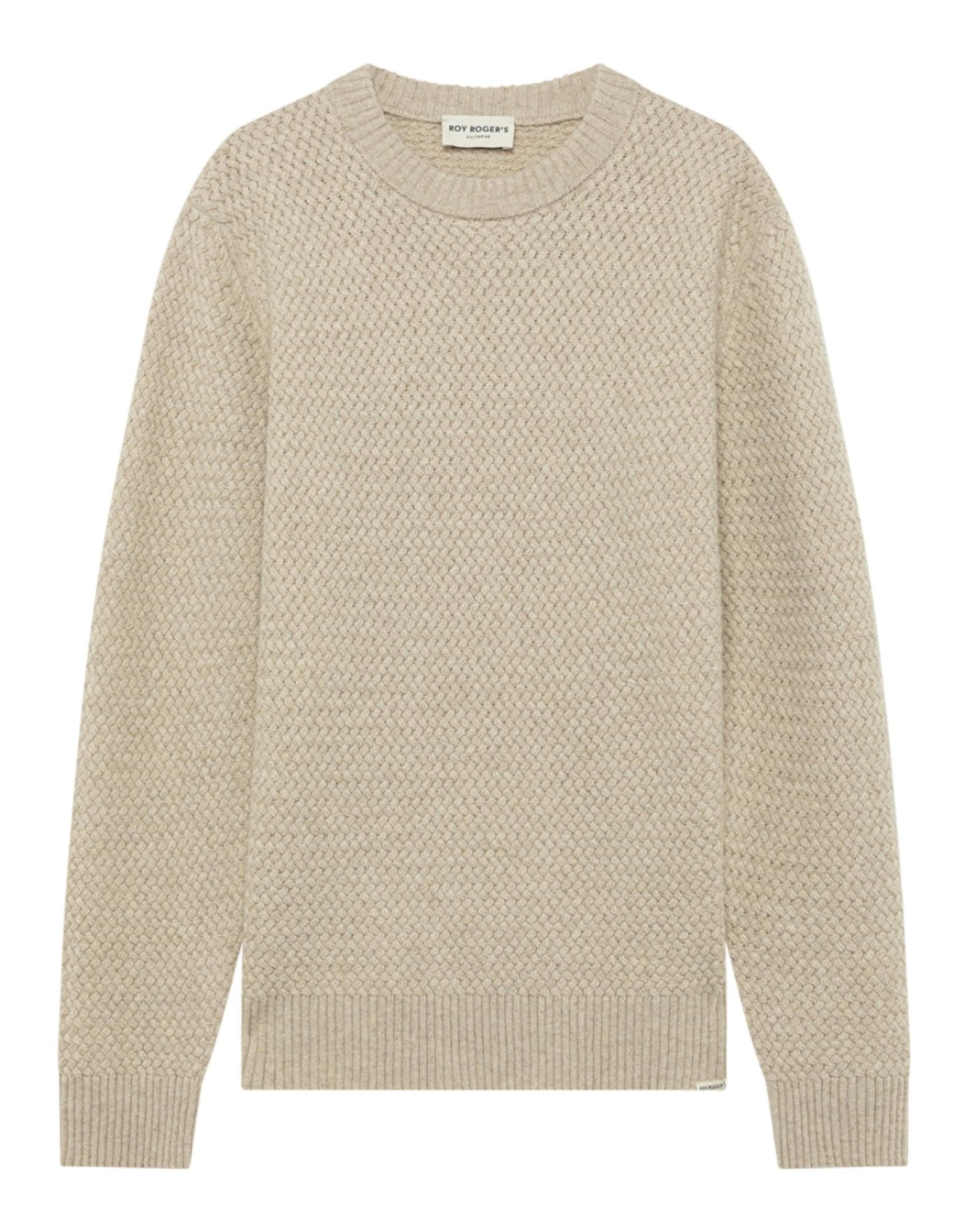 Maglione girocollo firmato Roy Roger's realizzato in pregiato filato misto lana e cashmere, con lavorazione canestro che dona al capo una texture raffinata e tridimensionale. Il modello presenta maniche lunghe raglan e finiture a costine su collo, polsini e fondo per garantire comfort e tenuta ottimale. Il logo Roy Roger's jacquard posizionato lateralmente sul fondo aggiunge un dettaglio distintivo e discreto. Una maglia calda e versatile, simbolo di artigianalità Made in Italy, ideale per completare look casual o eleganti.