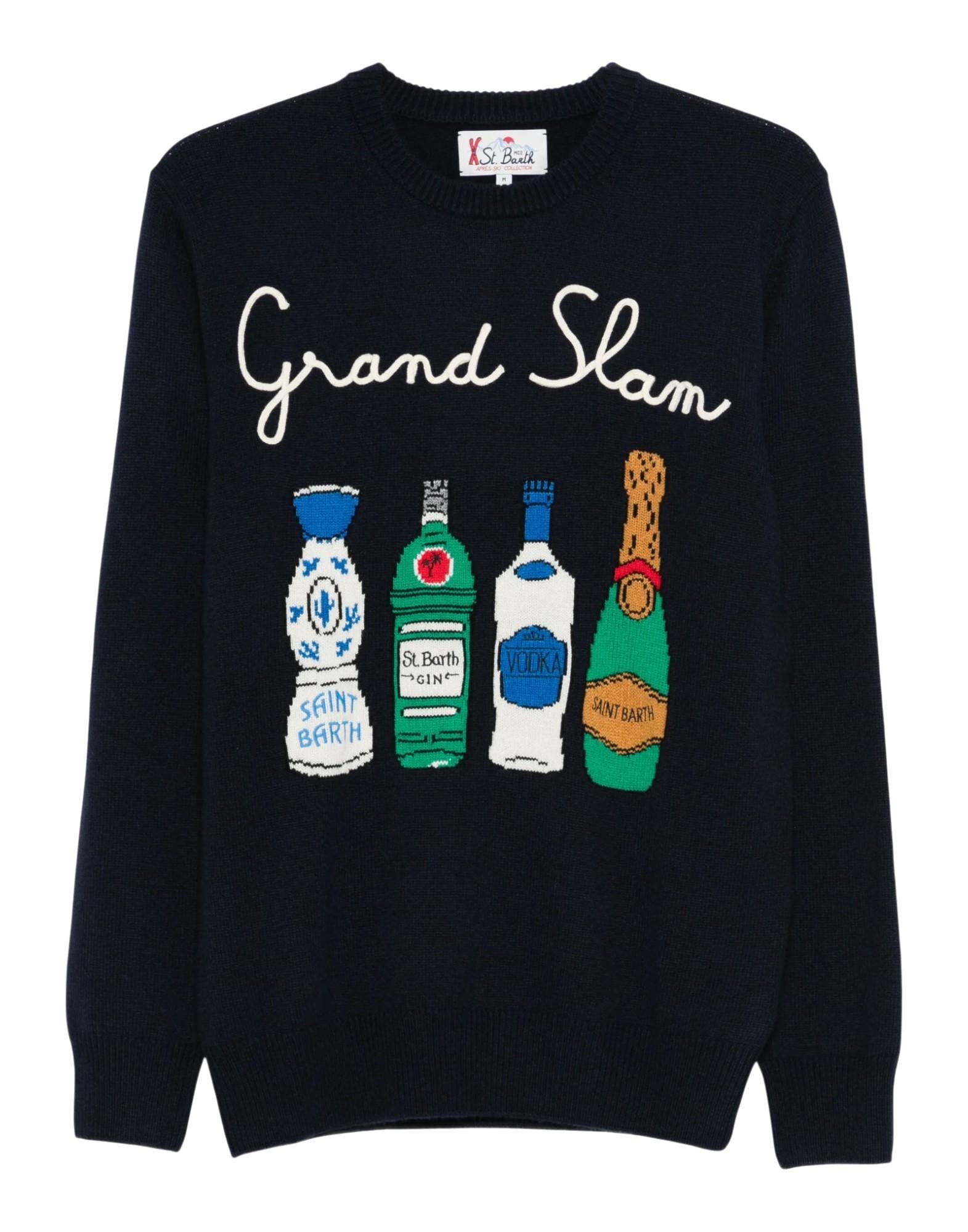 Maglione girocollo MC2 Saint Barth in prezioso blend di cashmere, lana, viscosa e poliammide, pensato per offrire calore, morbidezza e un comfort superiore. Il modello, caratterizzato dal motivo intarsiato "Grand Slam", unisce spirito sportivo e raffinata ironia, in perfetto equilibrio tra eleganza e stile casual tipico del brand.
