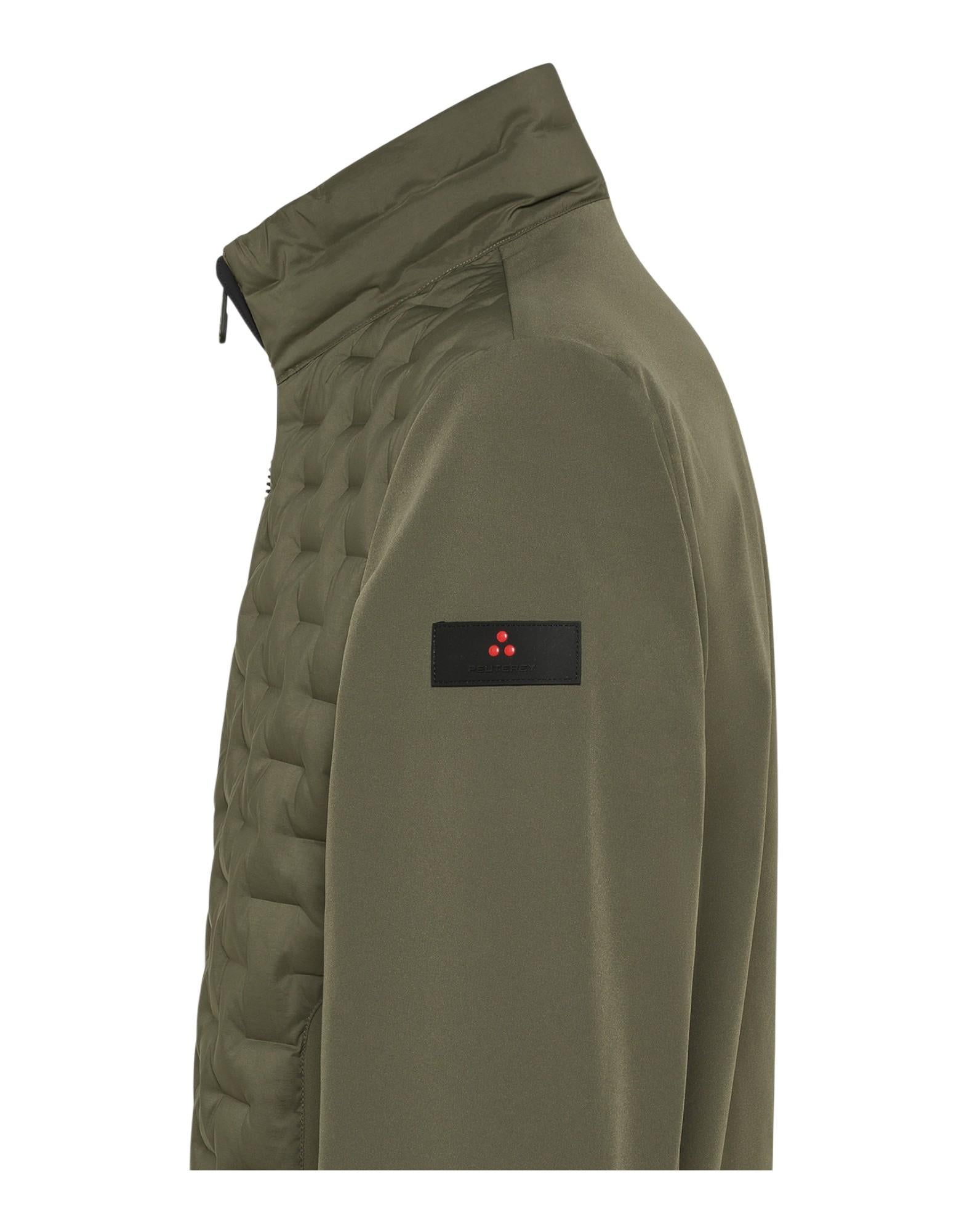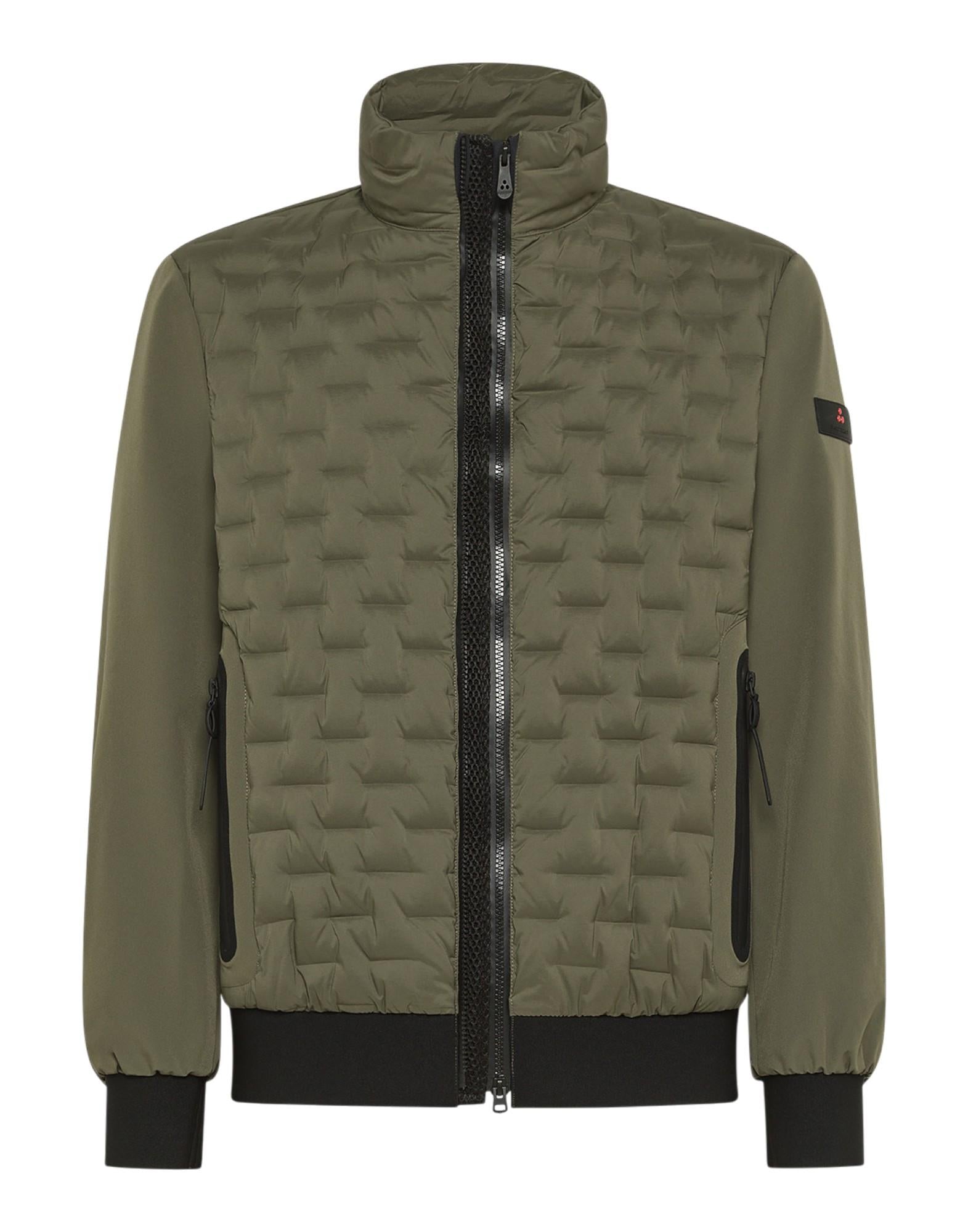 Bomber in doppio materiale con trapunta geometrica, parte della linea Transeasonal che unisce comfort, praticità e stile in un concetto urban versatile e contemporaneo. Il tessuto primario è un jacquard di poliestere stretch che, grazie a una speciale lavorazione di tintura, crea contrasti cromatici tra dritto e rovescio per un effetto ricercato. Il tessuto secondario è un soft shell di nylon stretch accoppiato con jersey di poliestere, soffice e caldo.