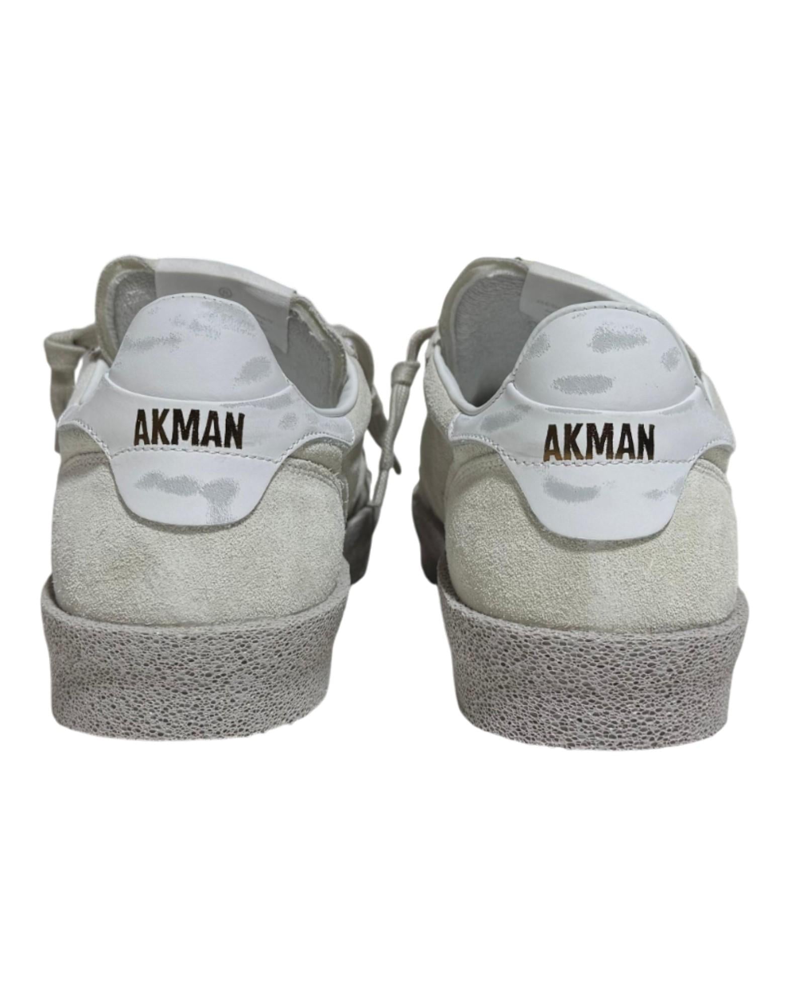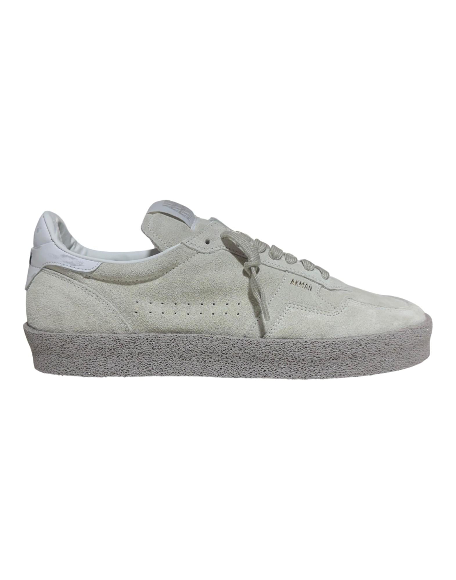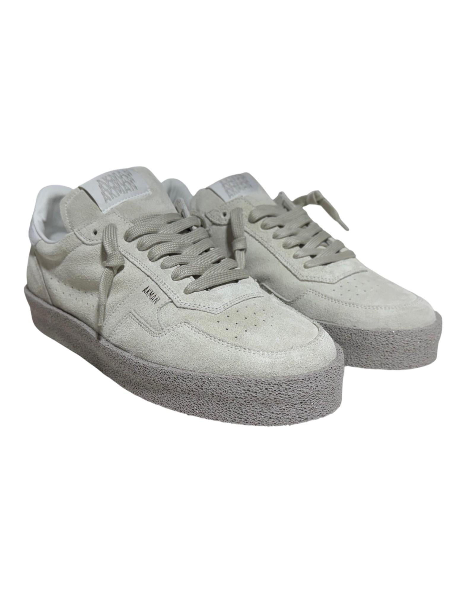 Sneaker dal fascino rétro e dalla costruzione artigianale, realizzata in morbido camoscio con finitura vellutata. La tomaia in tonalità beige sabbia è arricchita da impunture tono su tono e talloncino in pelle bianca con logo Akman stampato in contrasto, per un look pulito e raffinato. La suola in gomma effetto vintage completa il design donando stabilità, comfort e un carattere lived-in. Leggera, versatile e dallo stile senza tempo, rappresenta perfettamente l'identità urbana e contemporanea del brand Akman.