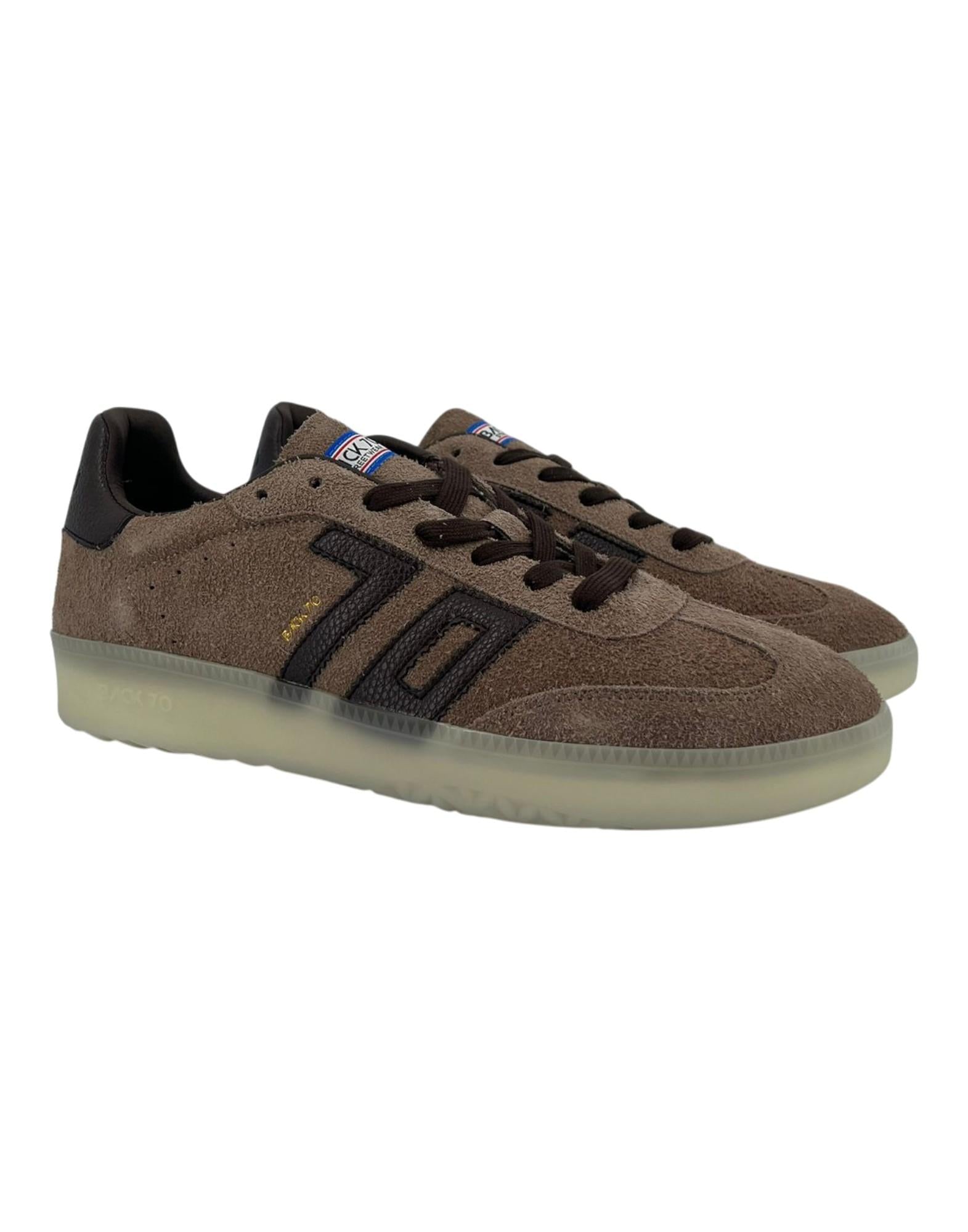 Il modello Boston LS03 è realizzato in morbida pelle scamosciata color taupe con dettagli in pelle coffee e logo "70" laterale in contrasto. La suola traslucida effetto vintage aggiunge un tocco contemporaneo, rendendola perfetta per un look casual e ricercato.