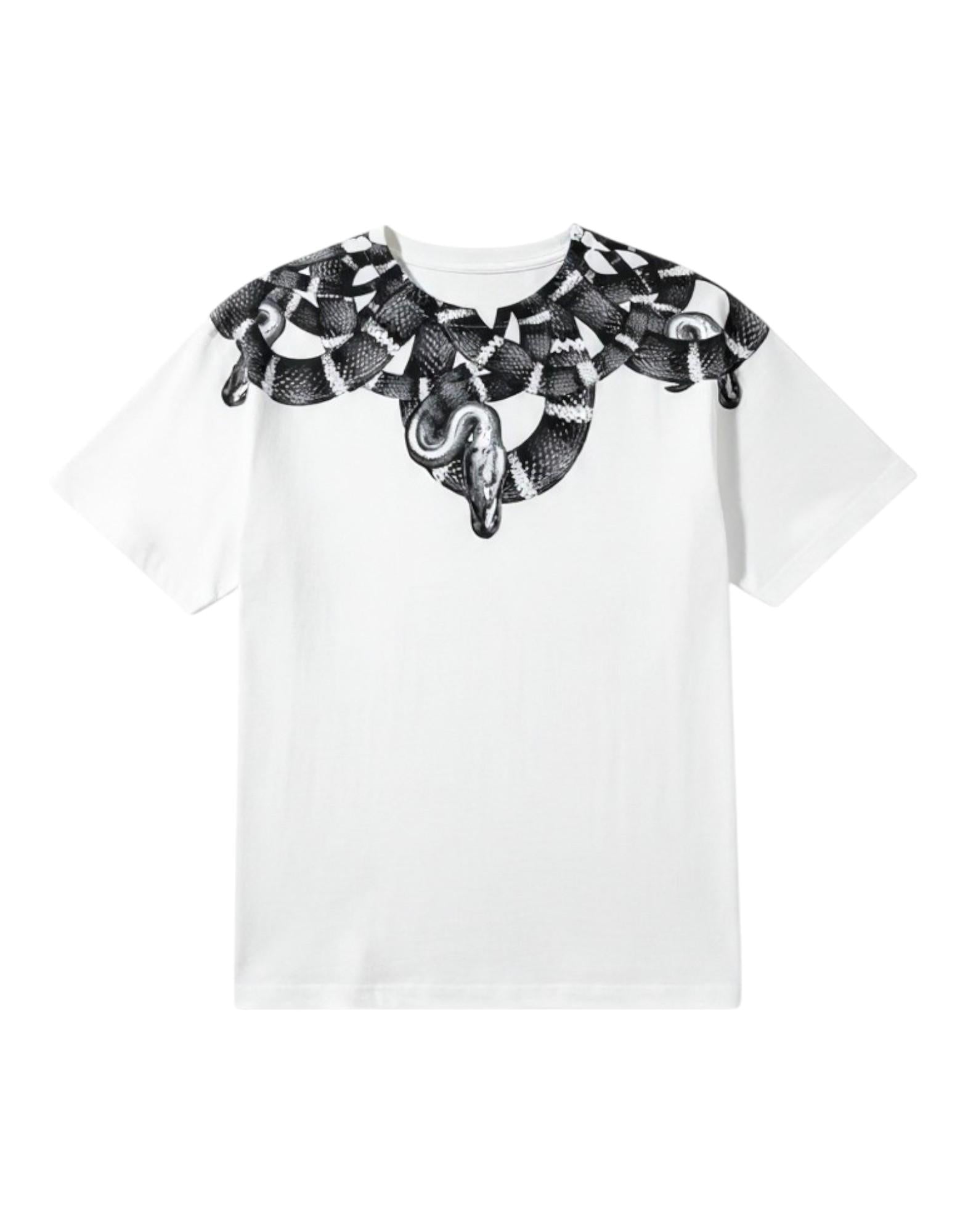 T-shirt uomo in morbido jersey di cotone 100% firmata Marcelo Burlon County of Milan. Il design distintivo è caratterizzato dalla stampa a serpente che avvolge il girocollo su fronte e retro, uno dei motivi iconici del brand. La linea regolare e il tessuto naturale garantiscono comfort e traspirabilità, mentre la grafica a contrasto aggiunge un tocco deciso e contemporaneo. Ideale per uno stile urbano d'impatto.