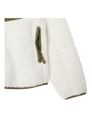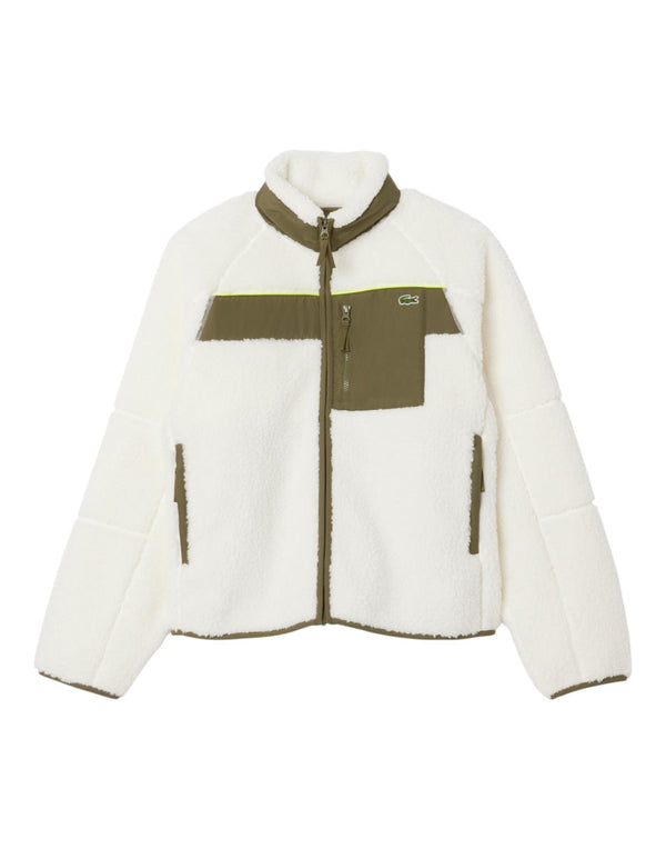 Giacca in pile sherpa con inserti in taffetà color block, dal design distintivo e contemporaneo. Offre morbidezza e calore grazie al tessuto sherpa, arricchito da dettagli curati come i bordi elastici a contrasto. Funzionale e versatile, è completata da tasca sul petto, due tasche laterali con zip e l'iconico logo coccodrillo ricamato.