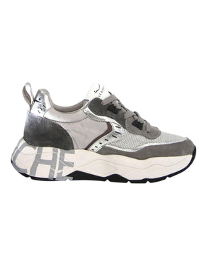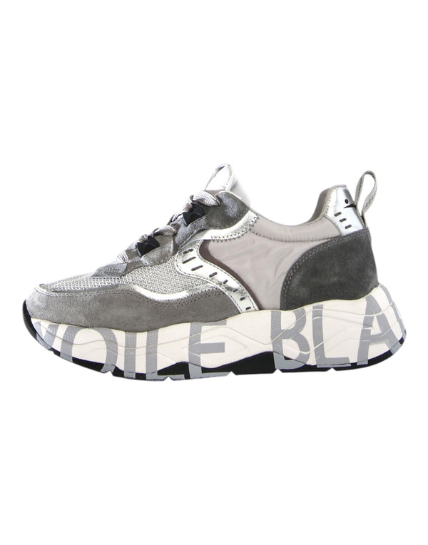 Sneaker urbana e contemporanea, realizzata in suede e nylon tecnico con dettagli metallici. La costruzione multistrato della tomaia dona dinamismo e raffinatezza, mentre la suola chunky con logo laterale assicura leggerezza e carattere.