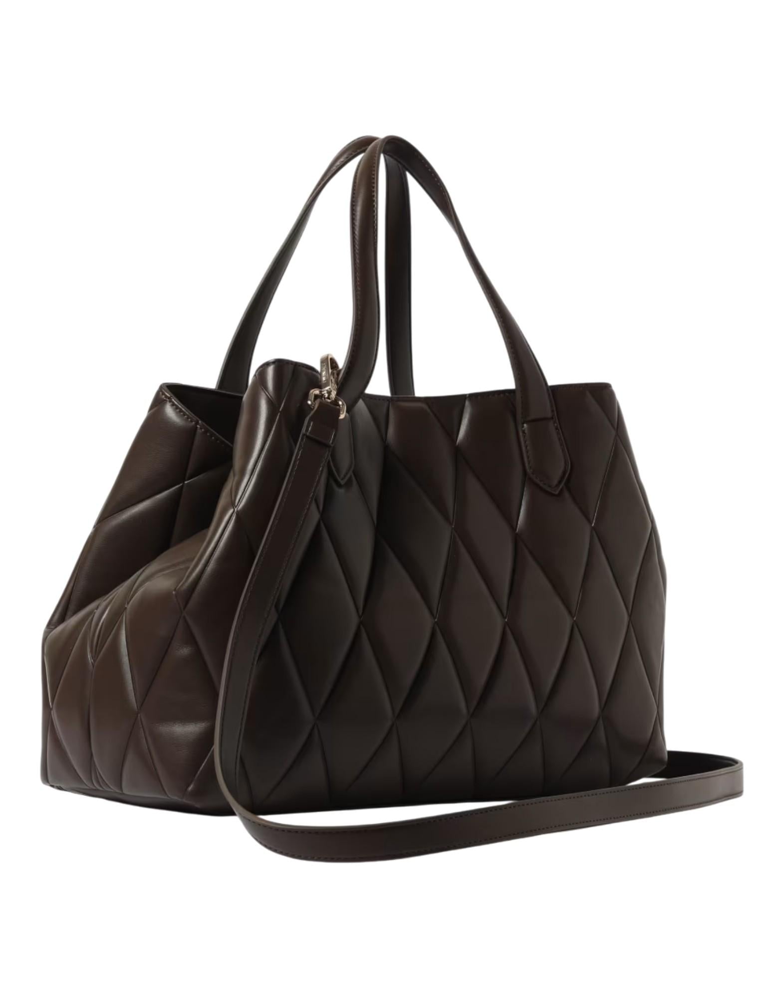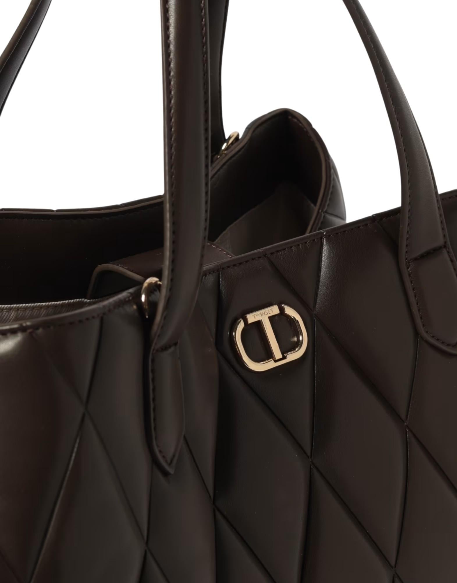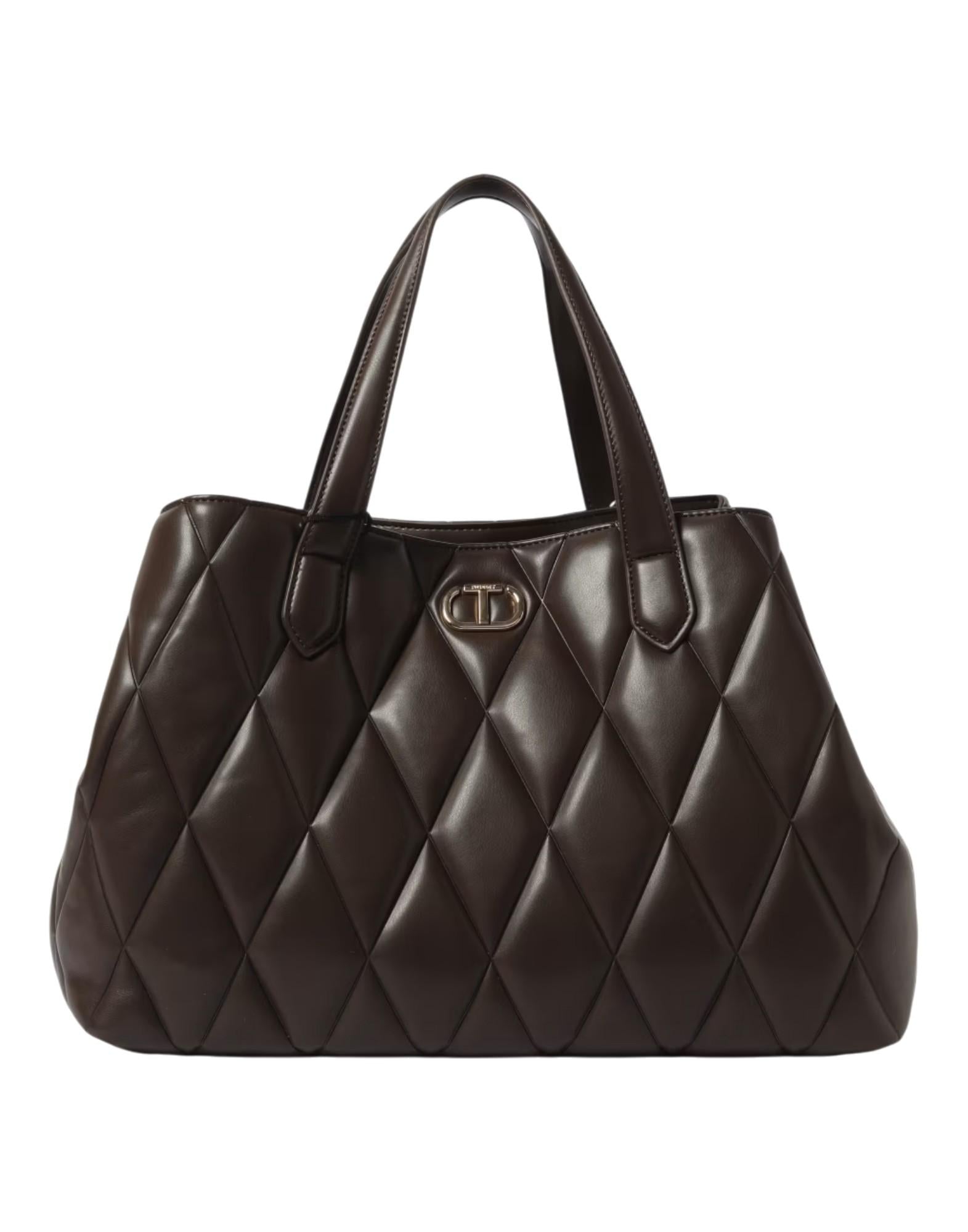 La borsa a mano in pelle sintetica matelassé Twinset unisce eleganza contemporanea e spirito casual. La costruzione svasata e la lavorazione trapuntata ne valorizzano il design, mentre il logo metallico frontale firma con stile l'accessorio. Dotata di doppio manico e tracolla regolabile e amovibile, si adatta con versatilità alle esigenze quotidiane.