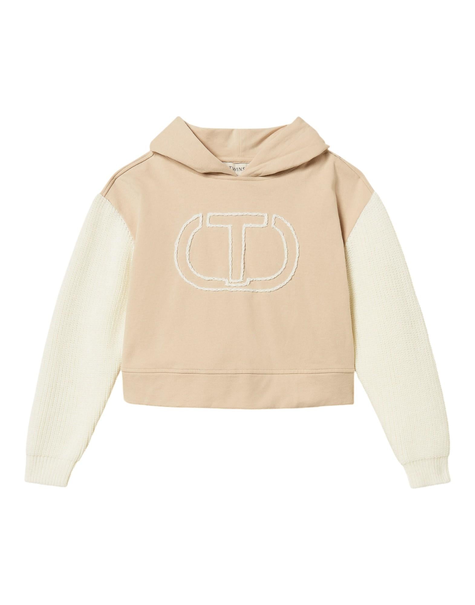 Un capo confortevole e raffinato, perfetto per completare i look casual della stagione. Questa felpa Twinset unisce la morbidezza del cotone elasticizzato al calore delle maniche in maglia lavorata, creando un effetto bicolor sofisticato. La linea morbida e la texture piacevole al tatto garantiscono libertà di movimento e comfort quotidiano. Il logo frontale ricamato aggiunge un tocco distintivo, mentre i bordi rifiniti e la costruzione mista esprimono il tipico equilibrio tra stile e praticità del brand.