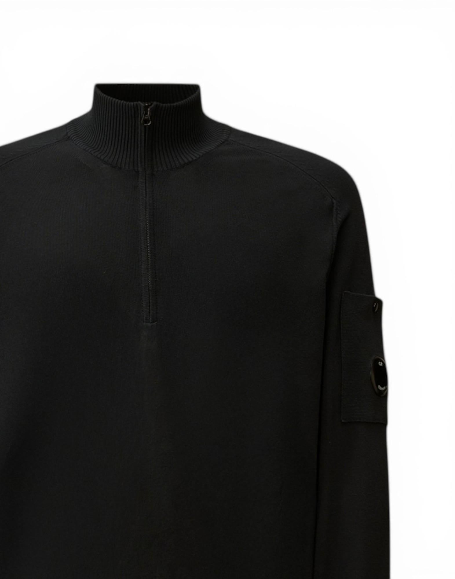 Maglione half zip realizzato in cotone crepe, un tessuto leggero e traspirante caratterizzato da una texture naturalmente irregolare. Il design è definito dal colletto a costine e dalle cuciture a contrasto sul giromanica, dettagli che valorizzano la costruzione del capo. Sulla manica è presente un taschino con l'iconica Lente C.P. Company, elemento distintivo del brand. I polsini a costine completano la struttura, mentre la tintura in capo con trattamento "Old" conferisce un effetto vissuto e sfumature uniche. Finezza 14 e vestibilità regular.
