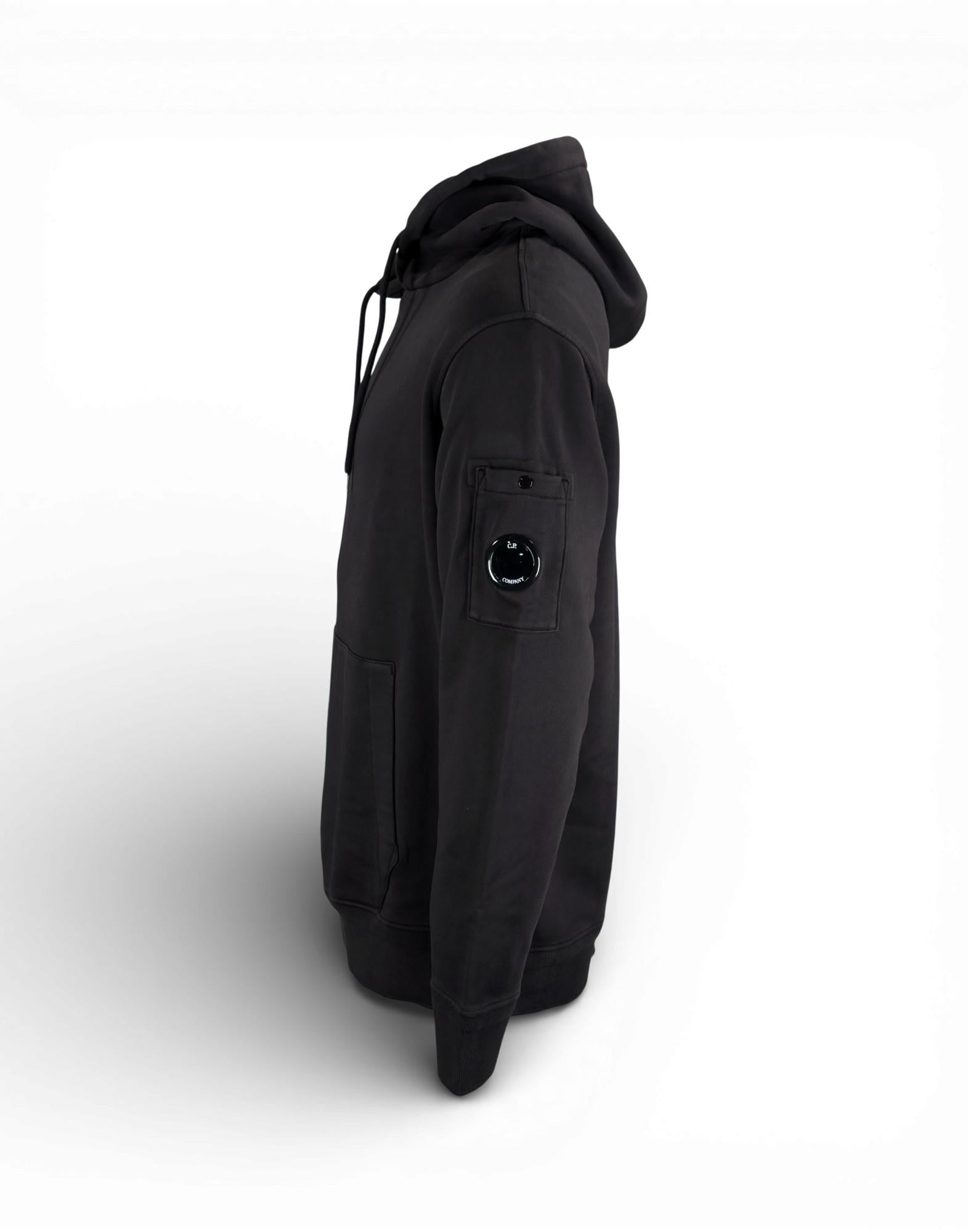 Il design include cappuccio regolabile con coulisse, tasca frontale a marsupio e fondo e polsini rifiniti a costine. Sulla manica è applicata la tasca con iconica Lente C.P. Company, elemento distintivo del brand.