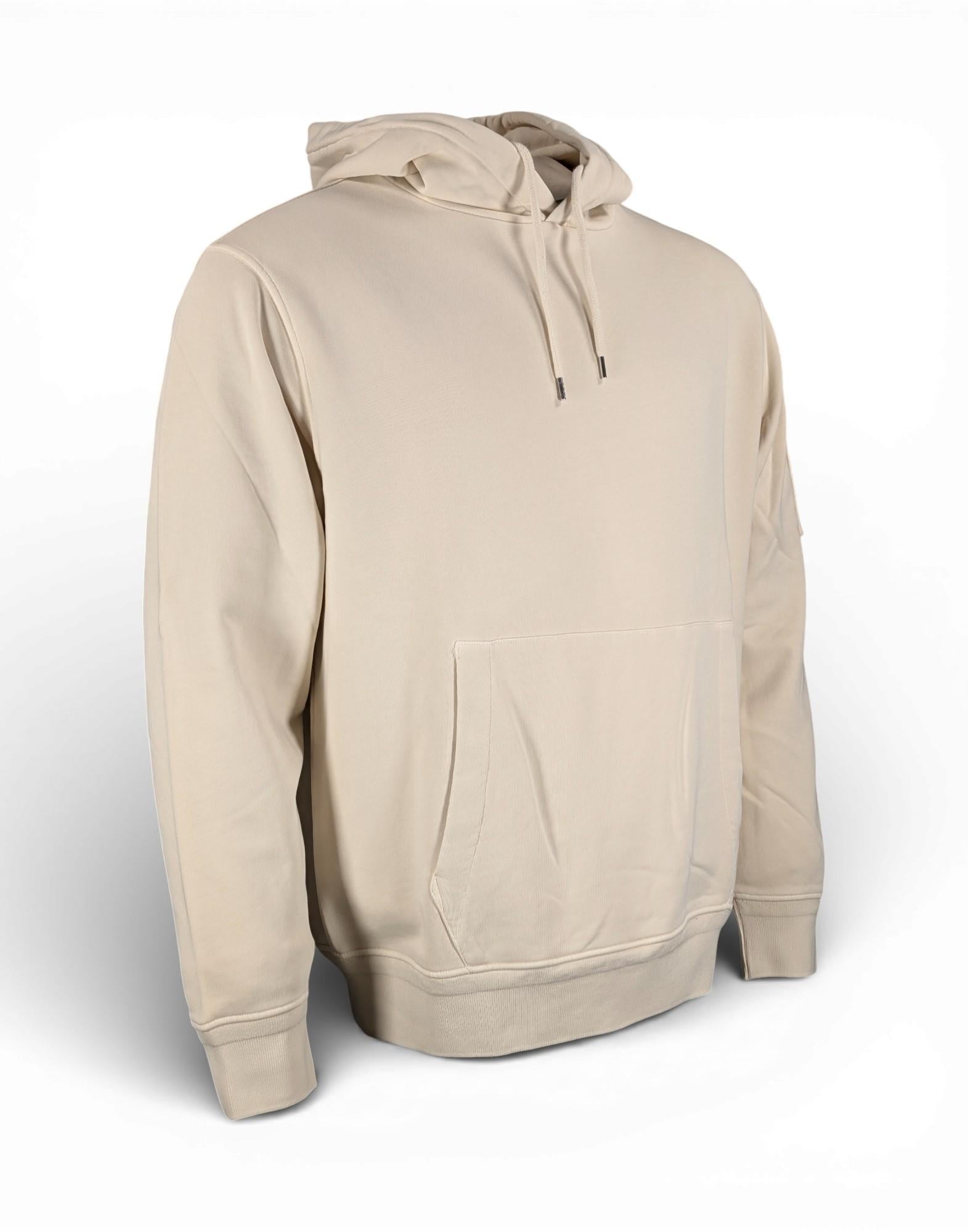 Il design include cappuccio regolabile con coulisse, tasca frontale a marsupio e finiture a costine su polsini e fondo. Sulla manica è applicata la tasca con iconica Lente C.P. Company, dettaglio distintivo del brand.