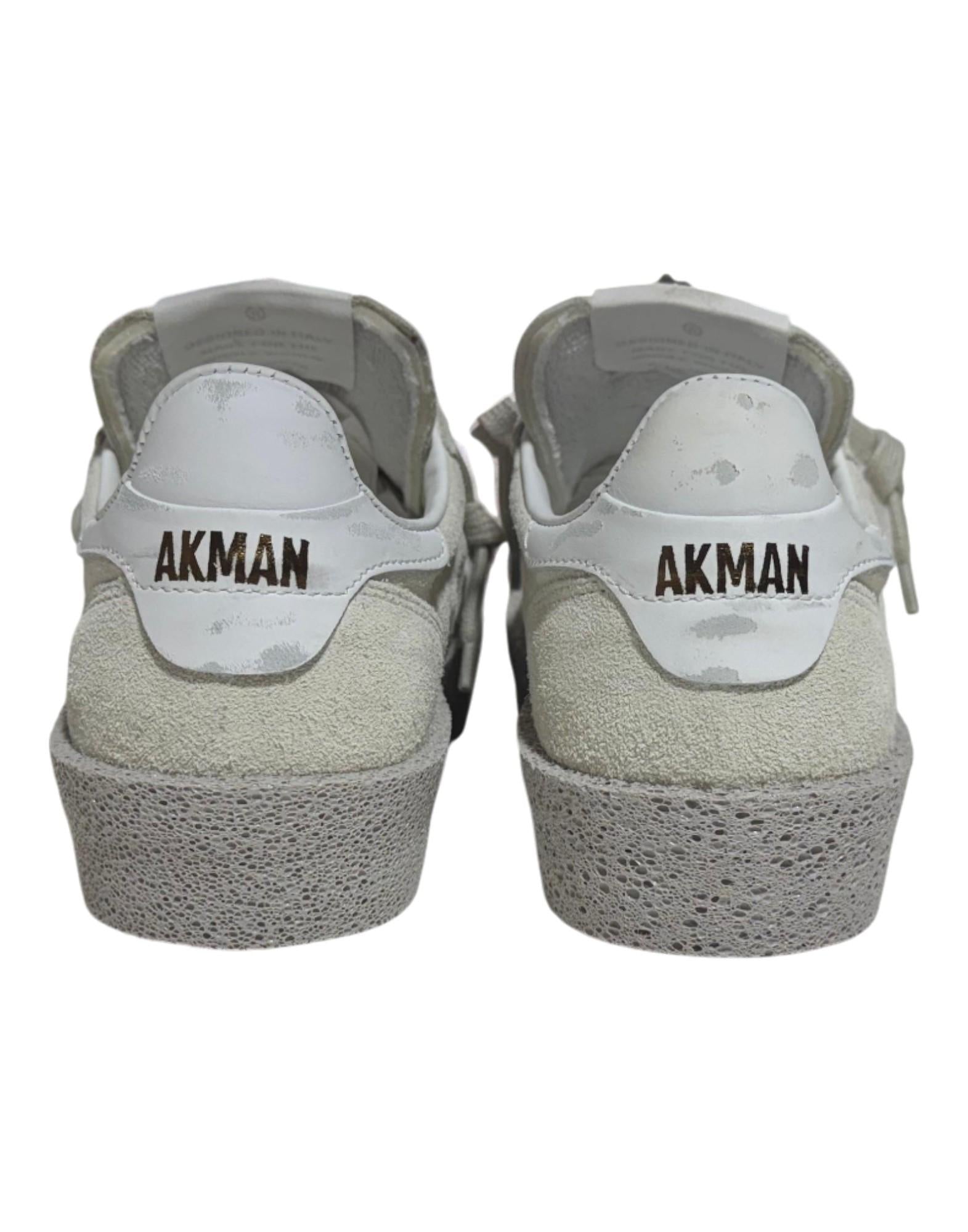 Sneaker dal design pulito e raffinato, realizzata in morbido camoscio con finitura vellutata nella tonalità bianco ghiaccio. La tomaia presenta impunture tono su tono e forature laterali che donano leggerezza visiva e traspirabilità. Il talloncino in pelle bianca con logo Akman a contrasto aggiunge un tocco distintivo e contemporaneo. La suola in gomma effetto vintage garantisce comfort, stabilità e un look vissuto elegante, mentre la fodera interna in pelle e tessuto assicura morbidezza e una calzata confortevole. Una sneaker essenziale ma ricercata, perfetta per look casual-chic e quotidiani.