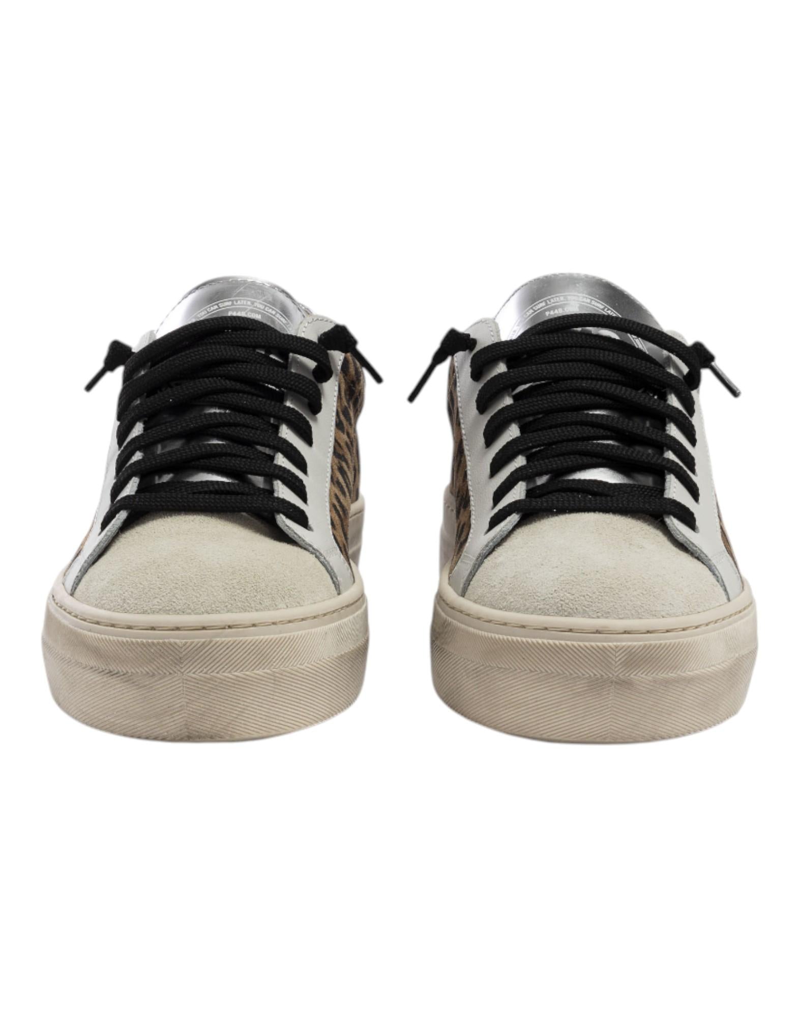 Sneaker platform dal carattere deciso, realizzata artigianalmente in Portogallo. La tomaia in pelle stampata leopardata è arricchita da linguetta e talloncino in pelle argento, rifiniti da profili in pelle bianca e punta in suede color crema. La fodera in spugna e la soletta in memory foam assicurano comfort superiore, mentre la suola platform in gomma P448, lavorata a mano con effetto vissuto, completa il design con un tocco distintivo.