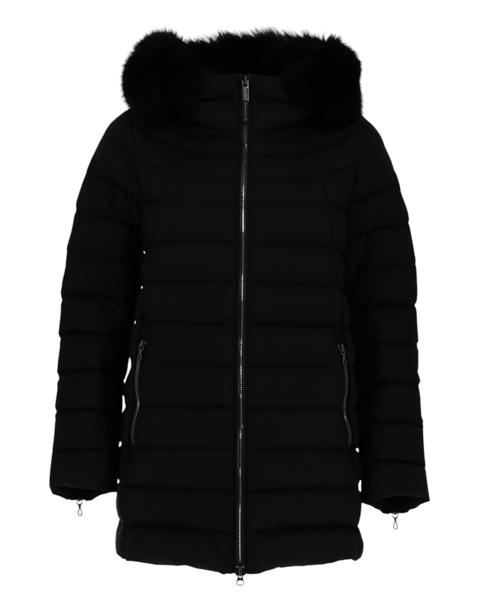 - Cappuccio fisso con bordo in vera pelliccia staccabile