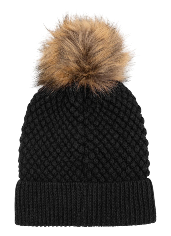 Cappello da donna in misto cachemire, lavorato a maglia con punto a grana di riso e impreziosito da un pon pon in pelliccia sintetica dal colore naturale. Il risvolto a coste assicura calore e comfort, rendendolo l'accessorio perfetto per affrontare le giornate più fredde con stile.