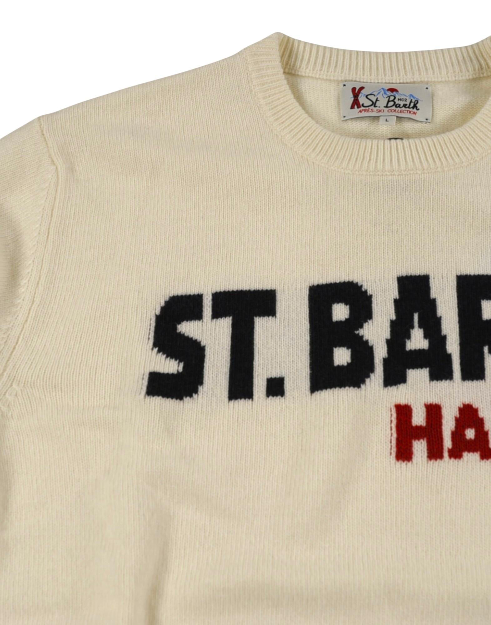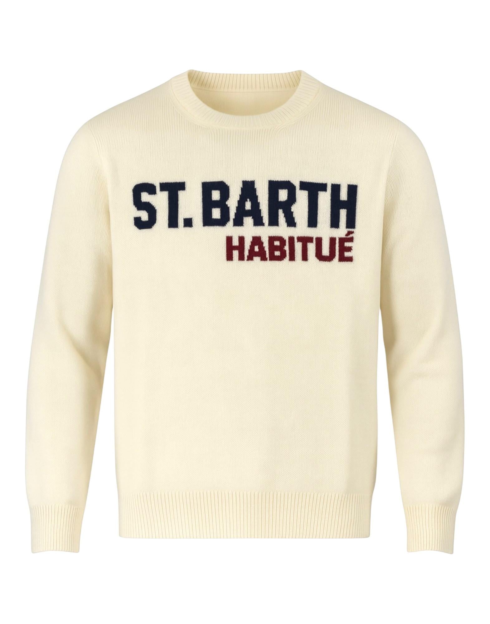 Maglione girocollo in morbida maglia a finezza regolare, caratterizzato dal logo frontale "ST. BARTH HABITUÉ" in rilievo jacquard. Le linee pulite e la texture compatta garantiscono comfort e vestibilità naturale. Rifinito con bordi a costine su collo, polsini e fondo per un look casual e raffinato allo stesso tempo. Ideale per la stagione invernale e perfetto da abbinare a denim o pantaloni in flanella.